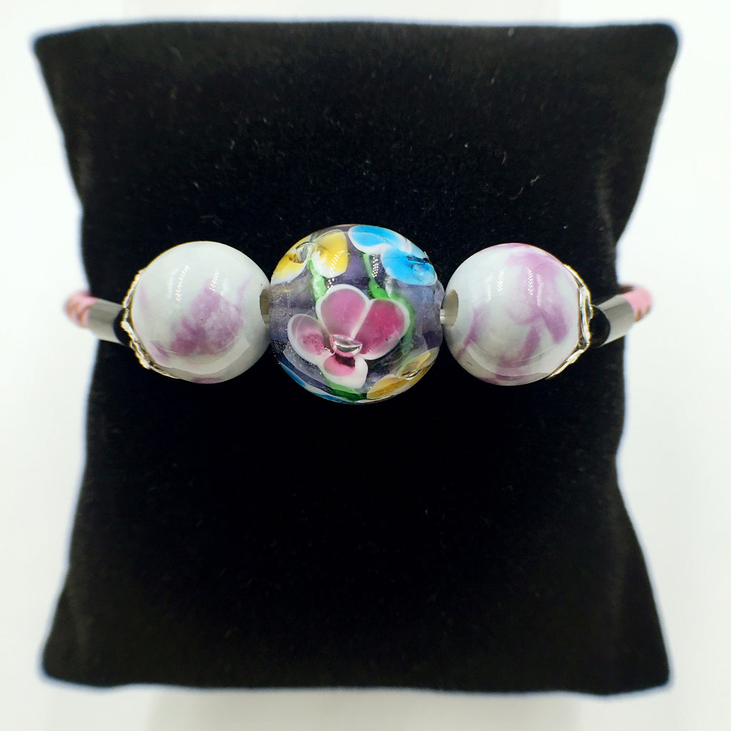 Triple Flower Purple and Ceramic Beads on Pink Leather